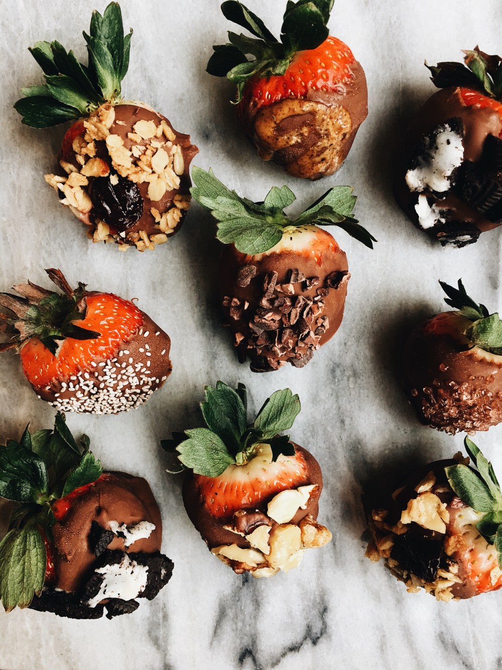- Once chocolate is smooth/melted, dip strawberries in and sprinkle with toppings, placing on parchment paper.