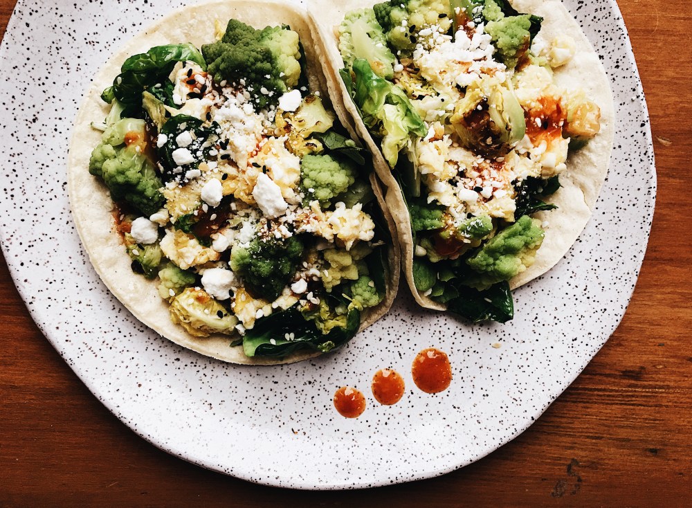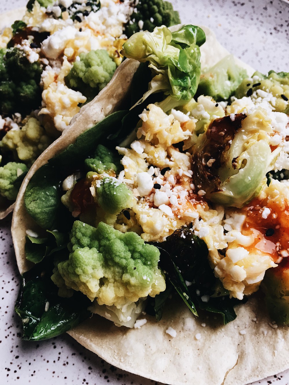 Scrambled egg, Romanesco, mixed greens, brussel sprouts, and garlic, all stuffed into two soft corn tortillas, topped with goat cheese crumbles, toasted sesame seeds and hot sauce.