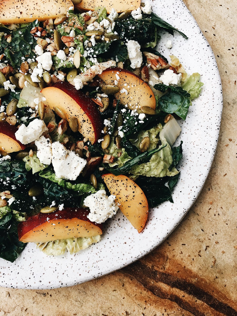- Top with pecans, pumpkin seeds, feta, nectarine slides, and black pepper.