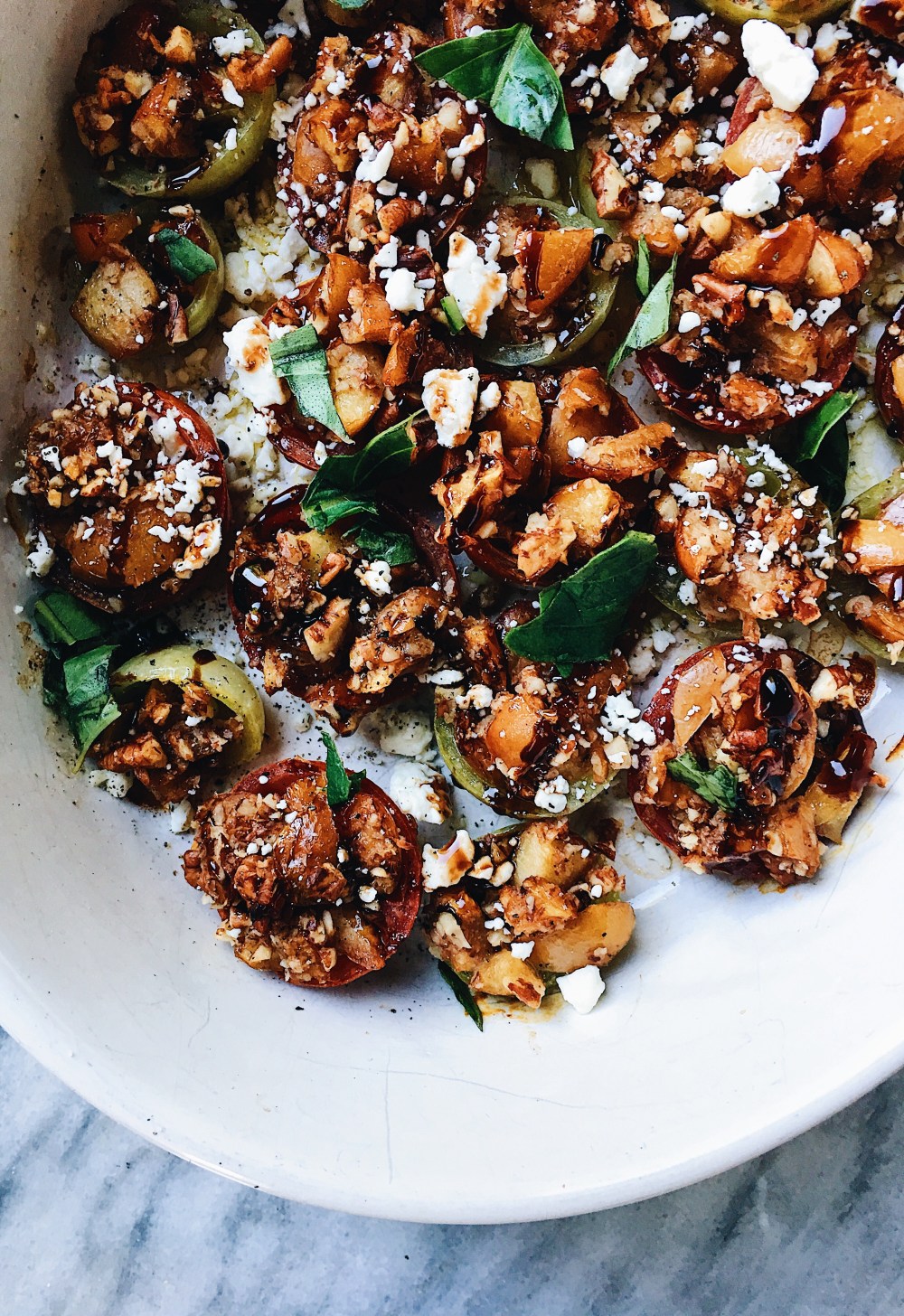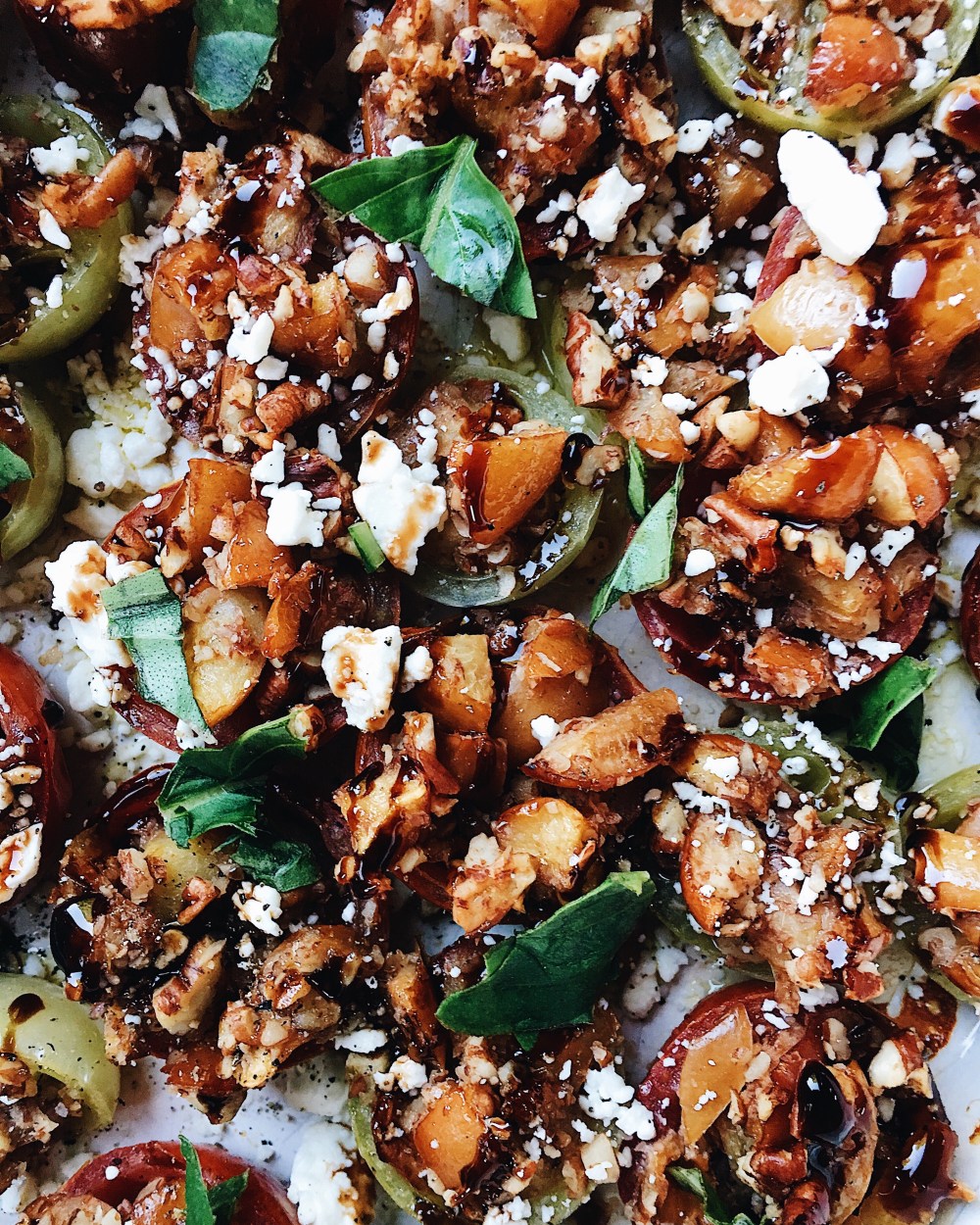 - Sprinkle tomatoes with black pepper, feta, torn basil and balsamic reduction.