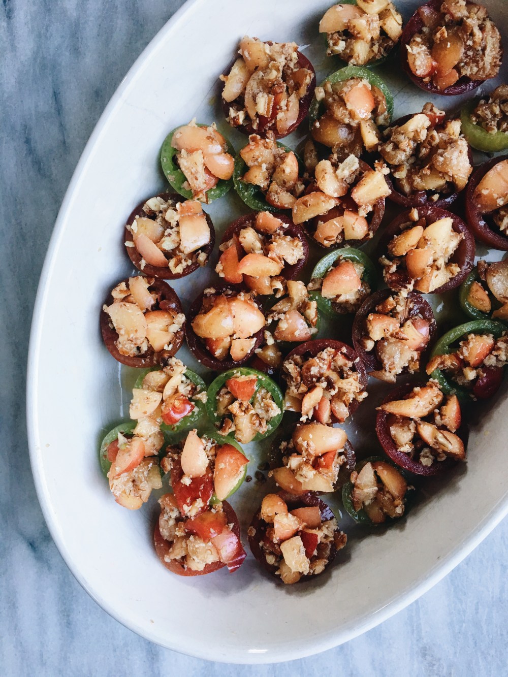 - Fill tomato halves with pecan/cherry filling (I used ~1 heaping teaspoon apiece, but you can eyeball it). Place stuffed tomatoes in baking dish.