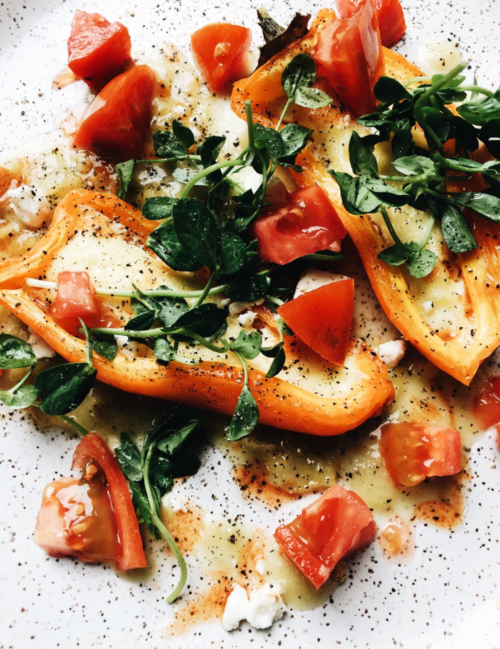 I’m a big believer that breakfast doesn’t have to be boring, and it also doesn’t have to be complicated. Do you know what you’re making for breakfast/brunch this weekend? You may want to try this recipe for egg stuffed sweet peppers, served over a tomatillo sauce and topped with cheese, diced tomato, and microgreens, all organic vegetables from Taproot Farm. You can even simply stuff the peppers with eggs and serve with whatever toppings or base you want. I hope you all enjoy this fun and flavorful recipe as much as we have. Happy breakfasting/brunching! 🙂