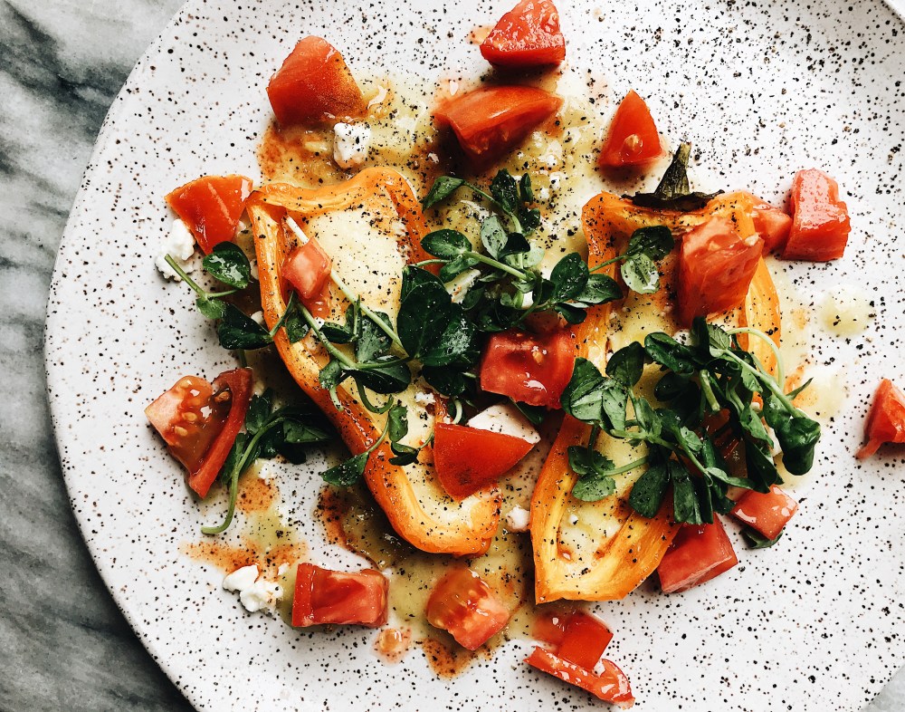 - Place pureed tomatillo on plate and add peppers on top. Sprinkle with cheese, microgreens, and diced tomatoes, drizzle with hot sauce and add black pepper if desired.