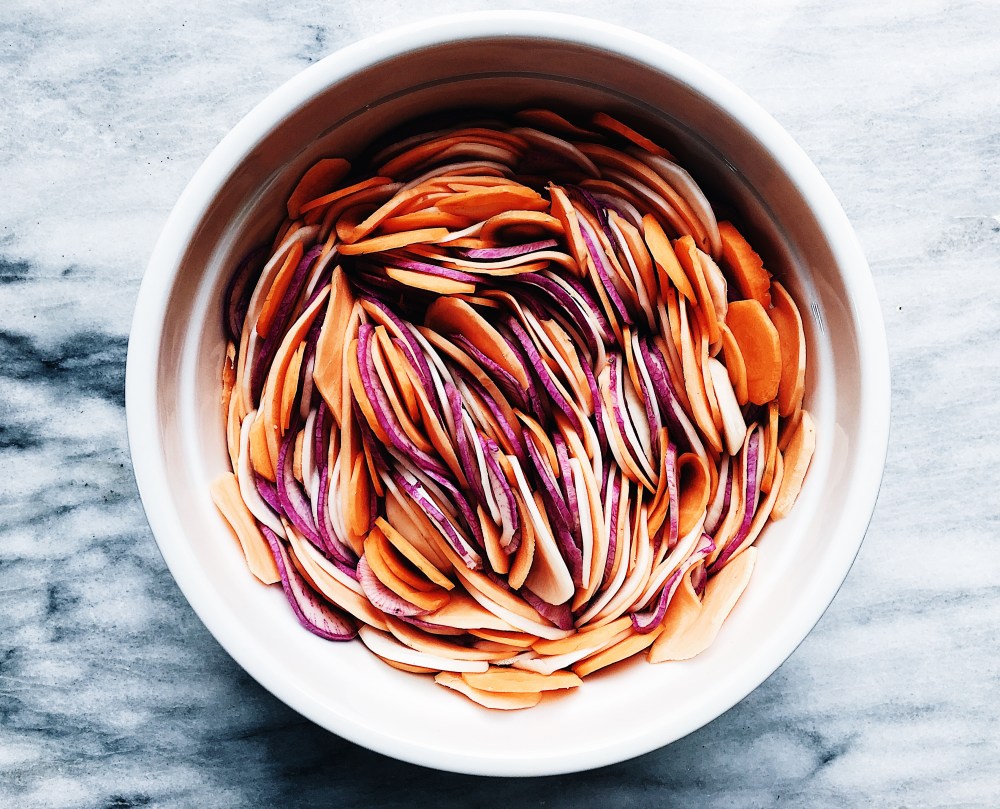 The first time I saw traditional ratatouille was as a cartoon in (you guessed it) the Disney movie “Ratatouille”. The dish always looked so beautiful with its sliced colorful vegetables perfectly arranged. Although my version is far from perfect looking, the colors and placement of the thin vegetable slices are quite eye-catching. For this recipe, I used a mixture of organic root vegetables from Taproot Farm – including hakurei turnips, carrots, purple daikon, and sweet potatoes. I used a mandoline for this recipe to cut the vegetables thin and then arranged them in a large round baking dish. I also topped everything with a sprinkle of panko and asiago (just for good measure). I was impressed that this entire dish was eaten in one dinner, and it’s definitely something that’s likely to become a meal staple (especially as the winter vegetables roll in). I hope you all enjoy this fun and creative recipe as much as I have – happy baking!