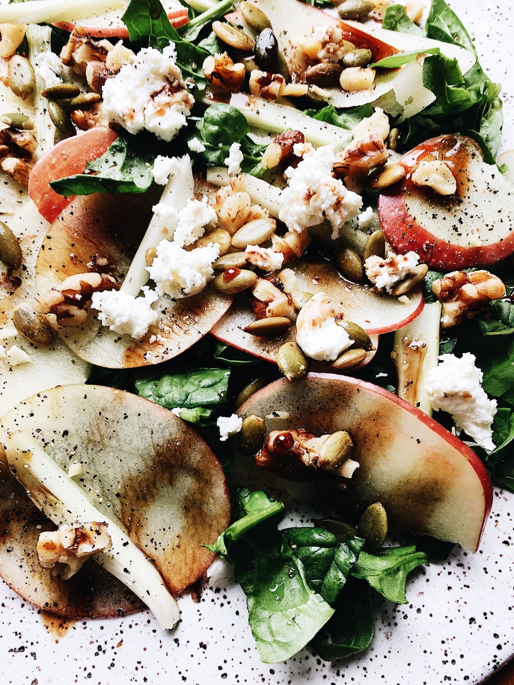 I can’t believe this is my final recipe of the Taproot Farm Summer CSA season. For those of you who have followed along, made my recipes, and shared feedback, thank you so much! I am greatly looking forward to the next 7 weeks of Taproot Farm’s Winter CSA, where I will continue to create and make recipes. This salad serves as almost a “bridge” between the Summer and Winter CSA worlds – apples, greens and fennel tied together with some crunchy walnut and pumpkin seed toppings. Very simple and nourishing, this salad is an easy go-to for a quick lunch or dinner. I’m always a fan of salads I can throw together with ingredients I already have at home. I hope you all enjoy this simple and delicious recipe, and please share feedback with me for any recipes you’d like to see in the Winter CSA season!