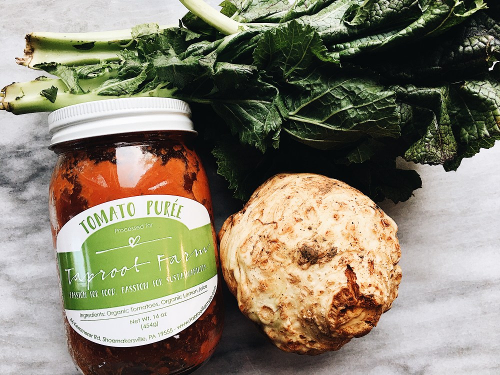 Traditional shakshouka is a dish of eggs poached in a sauce of crushed tomatoes, chili peppers and garlic. Common spices in this dish include cumin, paprika, cayenne pepper and nutmeg. The dish has roots a number of places, first thought to exist in the Mediterranean and Middle East. More recently, an egg and vegetable-based form originated from the Maghreb region of North Africa (and yes, I do want to credit Wikipedia for the quick and helpful overview!). I actually had shakshouka for the first time last year at Terrain Garden Café. It was pretty good, but admittedly the dish had way too much of a tomato base for me. I knew I needed to create a version with other vegetables to add a variety of flavors and textures. Therefore, I was inspired to use Taproot Farm organic kale and shredded celeriac root (in addition to their incredible tomato paste, garlic and onion for a base and microgreens for a topper!) to create the shakshouka version of my dreams. I have to say, this is hands down a new favorite of mine (pair it with some homemade bread/naan and cheese for a great mix of flavors and textures!). I hope you all enjoy this delicious and flavorful dish as much as I have – happy cooking and brunching! 🙂