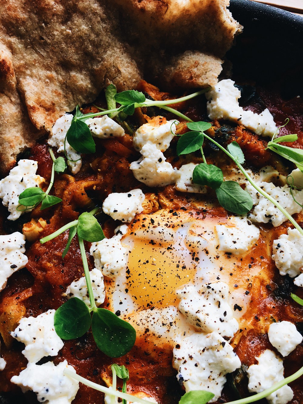 - Once egg is cooked, top dish with cheese, microgreens and black pepper.